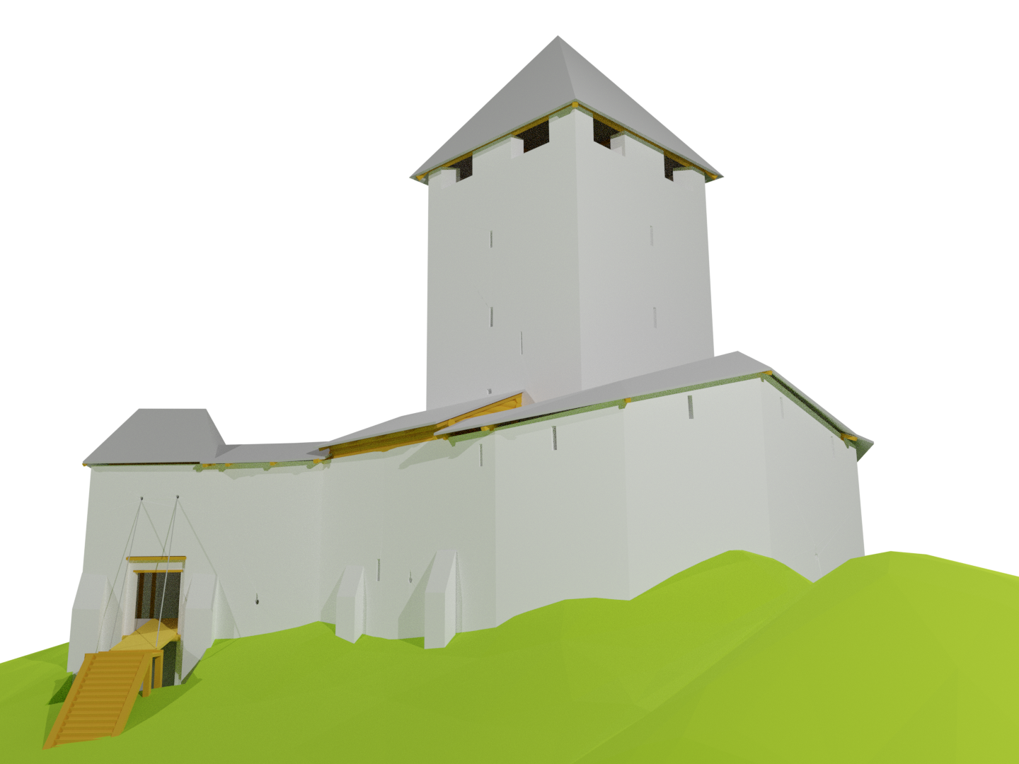 This castle was abandoned early in the 16th century and has preserved its medieval appearance until nowadays. The reconstruction bases on the survey in 2019 and paintings from the 16th and 17th century. However, all the paintings show the castle already as a ruin and the main gate area at the high castle’s entrance is very vage.