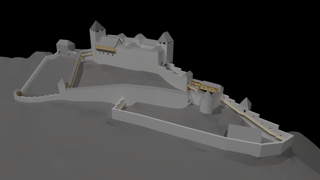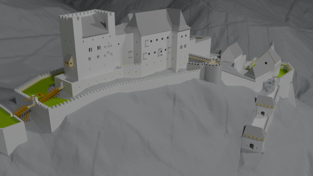 This site is a major landmark in styrian history. The castle dates back until the 13th century with late gothic adaptions and major renaissance renovations in the 15th century. The reconstruction bases on the 3D documentation in 2020 and a contemporary renovation plan from Domenico dell’Allio from the 16th century. Although the high castle can be easily reconstructed, the exact function and appearance of the secondary buildings would require detailed archeological excavations.